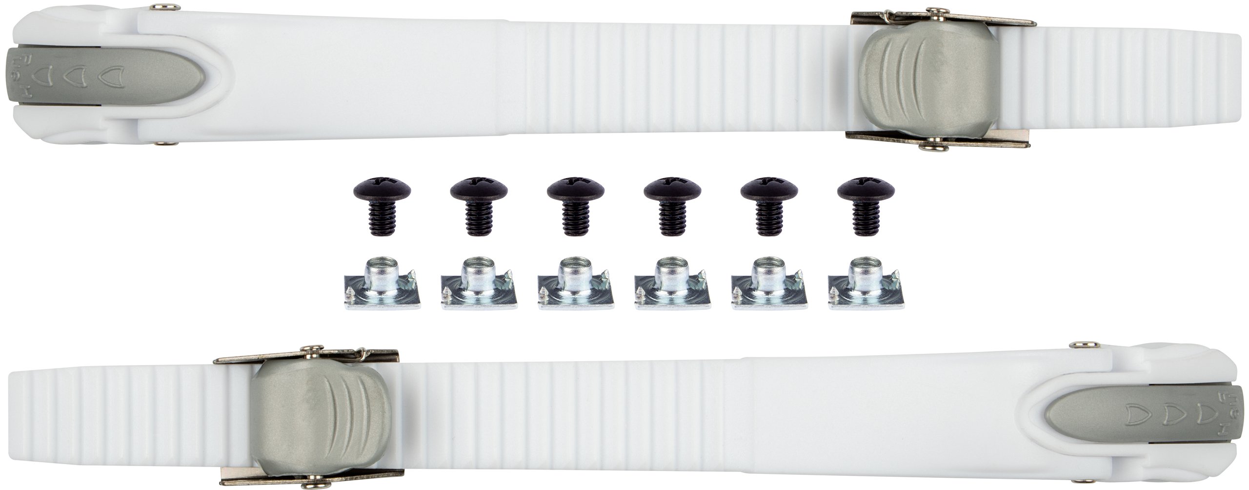 | Produktinformationen | • 2 PP plastic quick-locks including 18 cm PE strap, easily adjustable to fit every size skate • 2 PP adjustment clips • both the quick-locks as well as the clips are mounted to a stainless steel mountingplate • including 6 screws and 6 nuts |