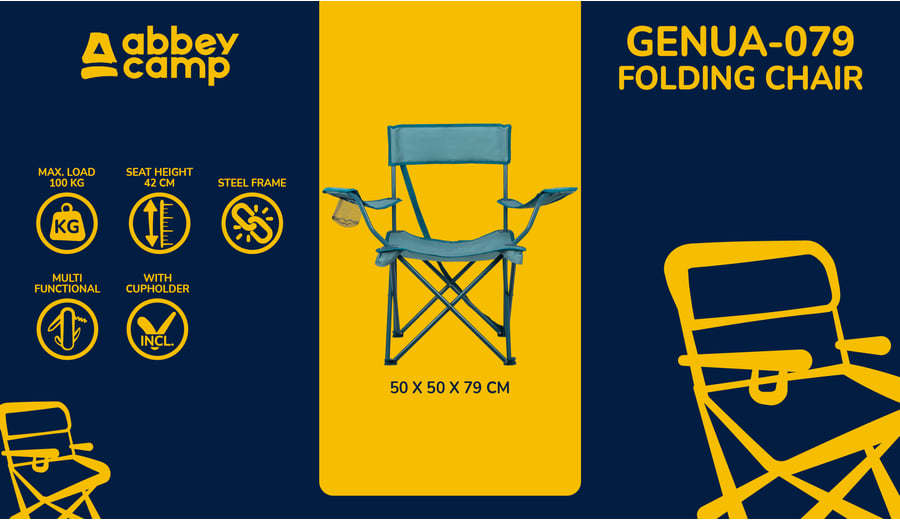 | Kenmerken | • multifunctionele, comfortabele vouwstoel • 600D polyester Oxford doek met PE coating, rondom afgewerkt met PP band • polyester mesh bekerhouder in één armleuning • stevig stalen frame met blauwe poedercoating • functioneel spinnenpoot-opvouwsysteem • handige draagband aan achterzijde stoel • afmeting ca. 50 x 50 x 80 cm • zithoogte ca. 42 cm • zitdiepte ca. 40 cm • geleverd in een handige polyester draagtas |