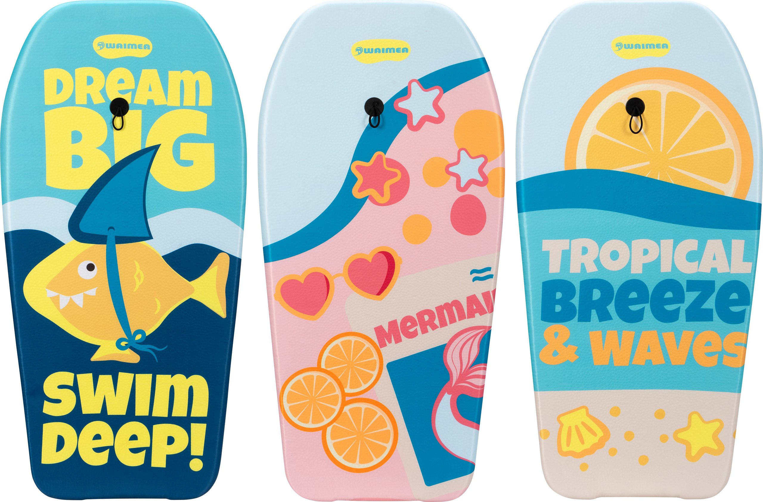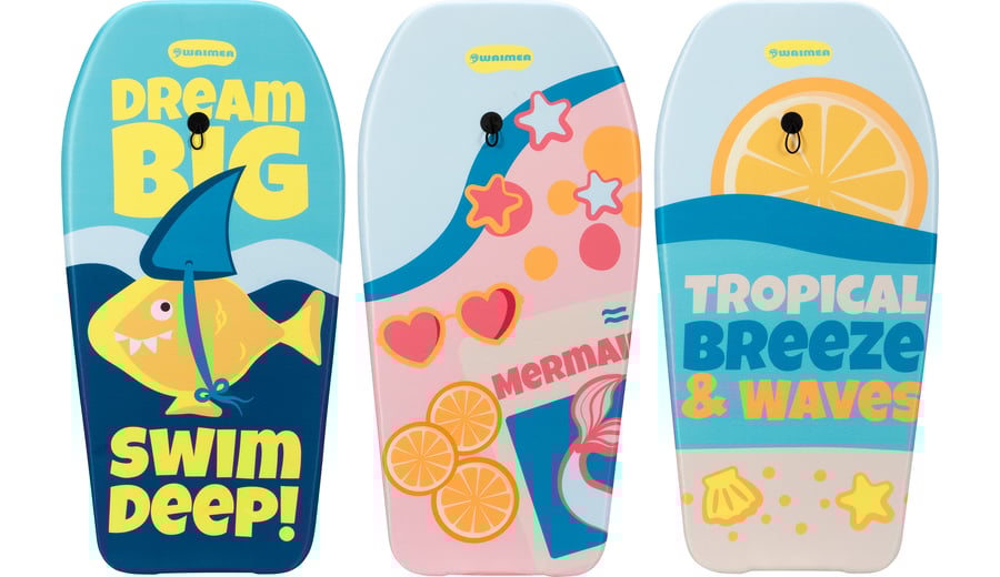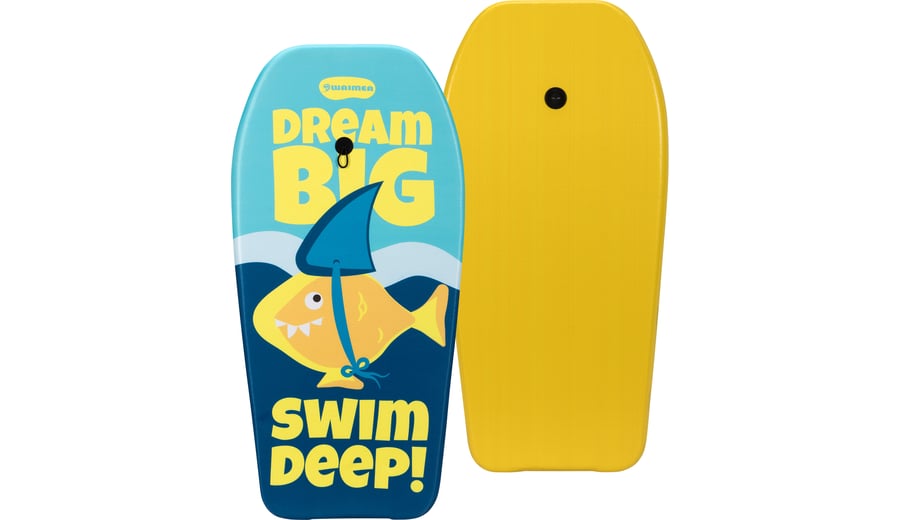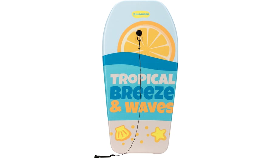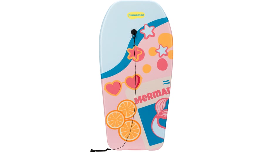| Kenmerken | • kleurrijk bodyboard van EPS (foam) vorm overtrokken met PE laag • bovenzijde voorzien van opdruk, uni onderzijde • koord met polsband voorzien van klittenbandsluiting • afmeting ca. 93 x 48 x 5.2 cm |