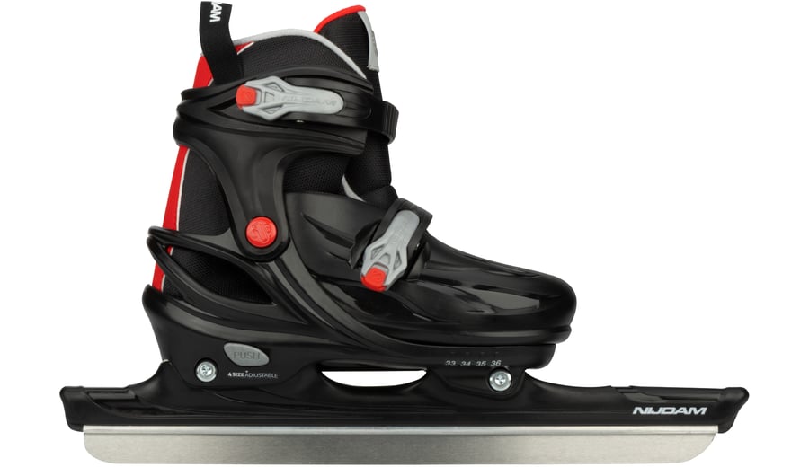 | Kenmerken | • In 4 maten verstelbaar d.m.v. drukknop aan de hiel • Design: hardboot van schokabsorberend high density LHDPE • Binnenschoen: comfortabel polyester met een voering van EVA en parelschuim • Sluitingen: dubbele snelsluiting • Chassis: high-impact PP schaatshouder • IJzers: roestvaststalen noren ijzers • Schaatsijzers zijn reeds voorgeslepen |